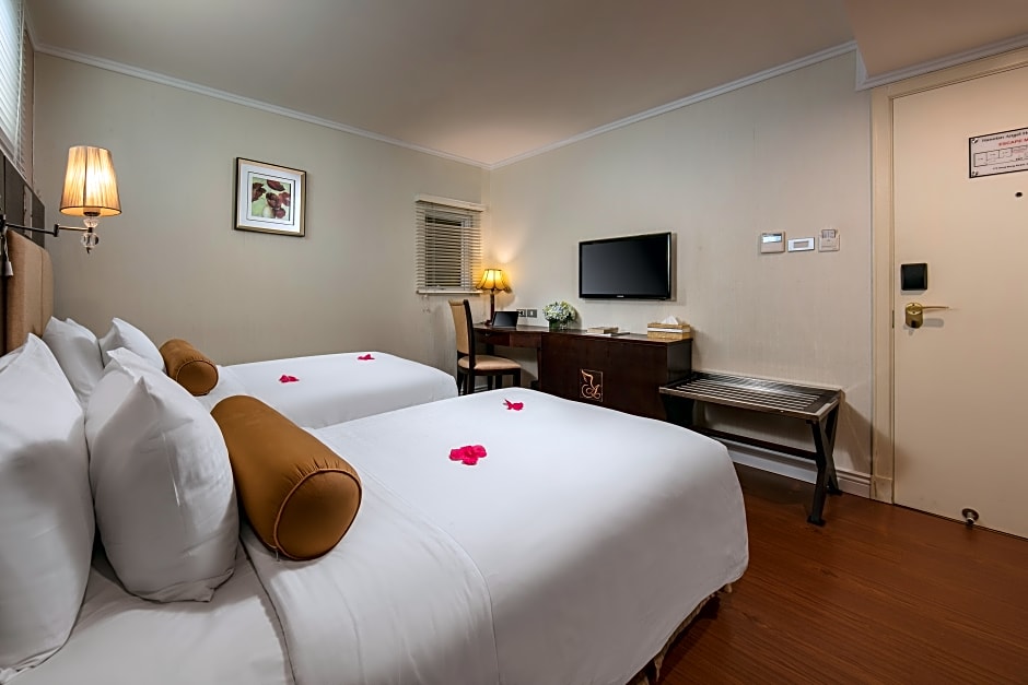 Deluxe City View is 269 square feet and includes either a king-size bed 150-183 width or 2 single beds 80-130 width plus extra beds on demand.